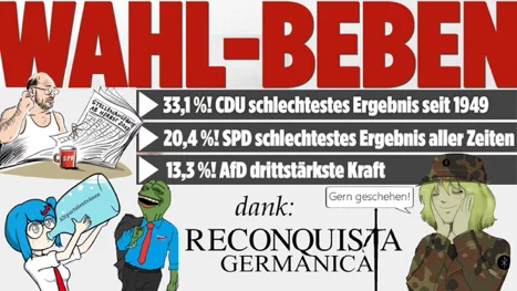 Reconquista Germancia has a Facebook page with almost 15.000 likes and followers (as of November 28th, 2017), a Twitter and a YouTube account. All these social media accounts share ridiculous pictures and memes revolving around the mainstream/establishment political parties (especially the CDD, SPD) and of course the AfD.