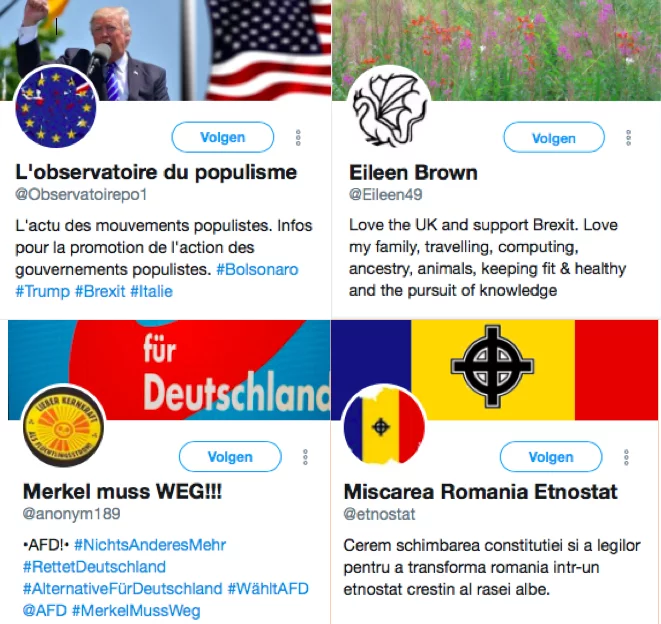 On Twitter and Facebook, Weidel's followers or digitalised fans, function as ‘the people’ she claims to represent.  What's interesting, is that these followers are not a homogenic mass. When you scroll through her Twitter followers, you see a huge group of people from different countries and cultural backgrounds. A lot of them seem to support Weidel, but you can also find accounts that oppose or even study her (like L'observatoir du populisme in the screenshot below). Most of her followers present themselves as being right wing in their Twitter bios and general accounts, as seen in the picture below.