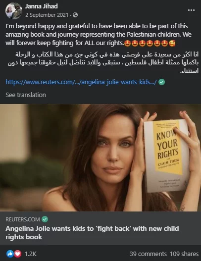 Her activism getting international recognition has had both positive and negative consequences. Being featured in Jolie’s book and her videos getting more views are wonderful career-wise but it does create a target on Janna’s back. Amnesty commits to take action to demand protection for Palestinian children like Janna.