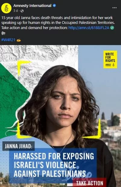 Almost daily, Janna faces death threats and intimidation. According to Amnesty: “Janna is at risk of physical violence, collective punishment, criminalization in military courts, and torture and other ill-treatment” (Amnesty, 2021). Amnesty International tries to call people for action to protect Palestinian children like Janna against violence (figure 4).