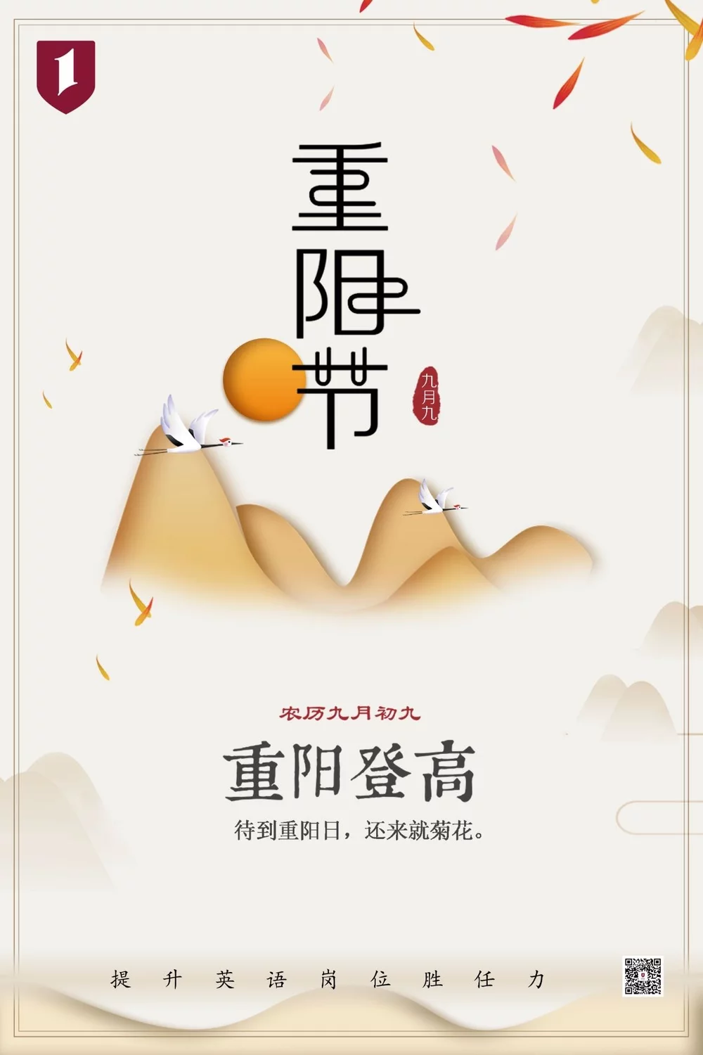 Similar to the two previous posters, the yellow background in this poster features a sun, two cranes, mountains, as well as scattered chrysanthemum-like petals. The company logo and QR code are located in the upper left and bottom right of the poster respectively. A very lightly colored cloud-line pattern can also be discerned between the mountains and the QR code on the right-hand side. The Chinese characters are composed of a variety of strokes and can be characterized by the relative position, such as top-bottom or top-middle-bottom composition. Incorporating the cloud-line pattern into the strokes of the simplified characters, the festival name “重阳节(Chongyang Festival)” is presented in an artistic typology design. For example, the top-middle-bottom structure of the character “重(Chong)” is made up of nine strokes. The middle part “田” of the character “重(Chong)” is replaced by the cloud-line pattern. Similarly, the festival’s name is written vertically, with the lunar date “九月九 (September ninth)” like a Chinese wax seal in the bottom right corner. Interestingly, the date “农历九月初九 (September ninth in the Chinese lunar calendar)” is put in red again and placed horizontally. Right below, four characters in a large font “重阳登高” (climbing to the top of mountains at Chongyang) present one of the most traditional activities of this day. Next, the two-line sentences “待到重阳日,还来就菊花 (By the time of the Chongyang Festival, I will come here again to appreciate the chrysanthemum flowers)” from a classical Chinese poem written by Meng Haoran (689-740AD) highlight that part of the day’s celebration is devoted to admiring chrysanthemums. Finally, at the bottom, the business’s slogan “提升英语岗位胜任力 (increase your English proficiency for English language jobs)” is expressed. This poster emphasizes the more historic, traditional elements of the festival by evoking collective cultural memories, diverging from the meaning of respect for the elderly promoted by the government.
