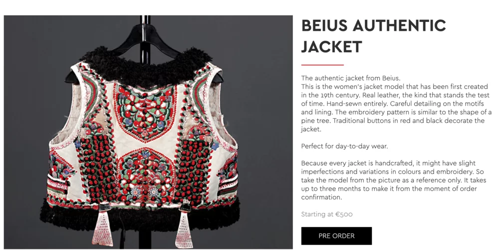 In their description of the Beius authentic jacket, Bihor Couture mentions the process that went into making the jacket, while putting emphasis on its authentic identity by pointing out the imperfections and variations in the handcrafting. By doing so, it revises and reclaims its history and cultural heritage after Dior copies the model and commodifies the jacket. In the conditions of capitalism, any object that enters the exchange system is inescapably commodified (Rogers, 2006).