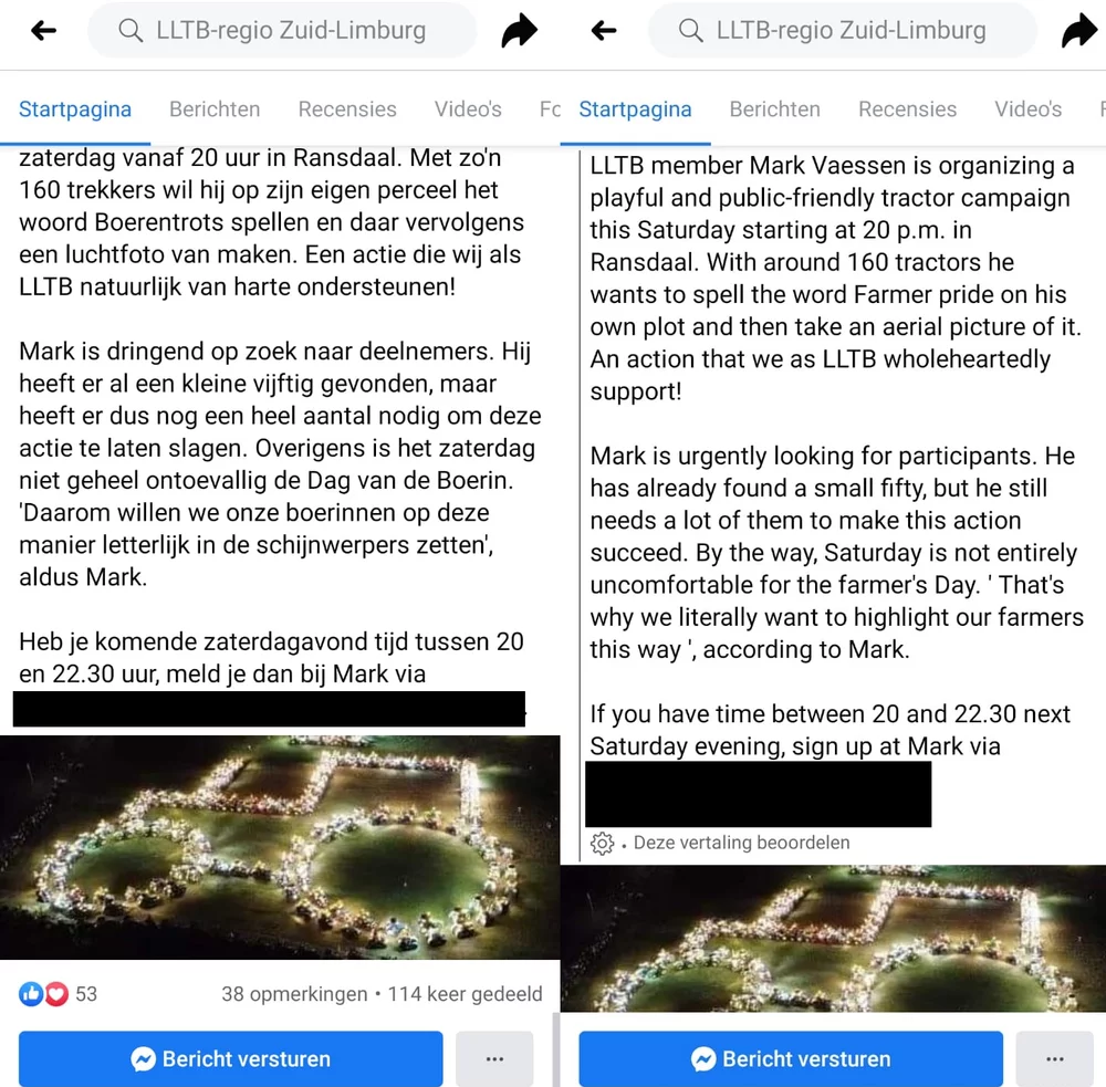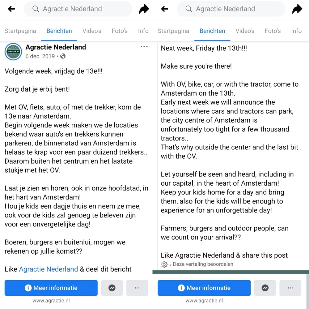 The Facebook page of Agractie, for example, is characterized by posts that inform farmers and other people on national and international news regarding the agricultural sector. Examples are news on imported products which are claimed to be local Dutch products by supermarkets or on how Schouten has made it official that she wants to halve the livestock of Dutch farmers. When people are then targeted by call-to-action posts such as the ones in Figure 4 and Figure 5, they may be tempted to engage more in offline actions as they are more familiar with the existing issues.