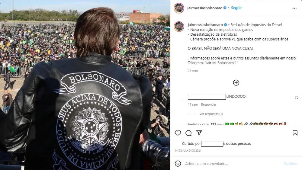 Such a theoretical framework helps understand Bolsonaro’s activity in digital media: when, in Figure 1, Bolsonaro announces tax cuts and guarantees Brazil won’t be a new Cuba, he claims to know the needs of the people and to defend them in the name of the sovereign People - a nationalist discourse in which there is a homogeneous national group with common interests and needs. As of the uptake of this discourse, supporters seem to appropriate the message: a user named @magnopng wrote “My Captain, you are God's Envoy to help this nation! You are the CHOSEN!”. Congresswoman Caroline de Toni also comments “President Bolsonaro is truly committed to defending our freedom and changing the leftist landscape that our nation has been handed over for decades. (...). Let’s pray for the president and for Brazil”. Such a comment reached more than six thousand likes and several replies on Instagram.