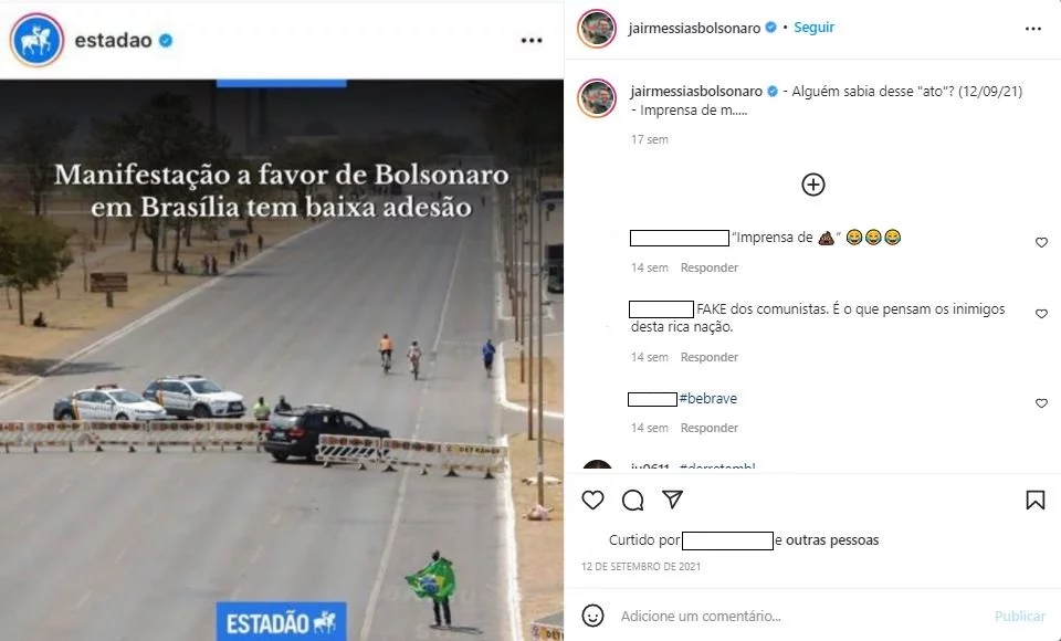 In Figure 2, Bolsonaro reposts on Instagram a news from razilian newspaper Estadão, covering the low-adherence of a demonstration in support of the government. Then, it is asked: “Did anyone know about this ‘act’? Shitty press”. It is thus the interaction among older and newer media that should be taken when analysing the construction of Bolsonaro’s message in the hybrid media system, as suggested by Chadwick et al. (2016).