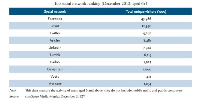 “Brazilian web culture is heavily driven by the consumption of content published or found through web portals, and the use of a variety of social media. Four of the 10 most visited websites in Brazil in September 2013 are primarily UGC (Facebook, YouTube, Mercado Livre, and Wikipedia); another four are web portals (UOL, Globo.com, Live.com, and Yahoo!). The remaining two are Google search domains (Google.com.br and Google.com).”