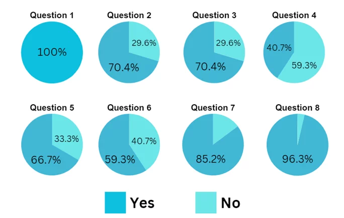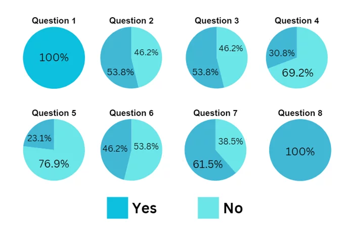 The average age of the students living in the favela is 16.38 years old. 5 participants are female, and 8 are male. The frequency of responses to the survey questions can be found in table 1, and the percentages can be found in figure 1.