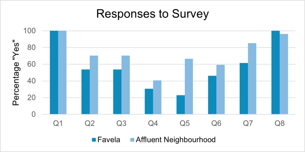 The data for this analysis was obtained using surveys. For the students from the favela, I contacted an organisation based in Pavão-Pavãozinho and Cantagalo, Rio de Janeiro. EduMais is a non-profit organisation established to help youths living in challenging circumstances. Growing up in these challenging circumstances can influence the beliefs and lives of these youths (EduMais, 2019). Due to a large amount of armed conflicts, it can be hard for them to differentiate between safety and unsafety. These traumas can lead to an impairment in the students’ academic potentials. EduMais helps these students by first processing their traumas and developing their social learning, and then by equipping them with skills to use in the modern world. These skills include Web and Game Design and English classes. In one of their English classes, the topic of the class was technology. At the end of the class the survey was given to the students. The survey can be seen in figure 1. Due to the limited time available in class, as well as the slight language barrier, a simple yes/no format was used to ensure clarity of the survey.