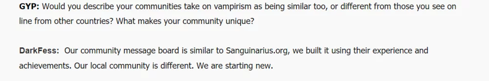 Newcomers to the vampire world adopt the indexes of the group in order to become part of it – the dress style, beliefs, feelings, and methods of feeding. However, identity indexes differ from one context to another, and some of them are recognized on a global scale, while others have a more local scope (specific to a country and a city). For example, the gothic style of dressing and the fake fangs are common indexes for the vampires in the USA and parts of Europe because they have existed as a community for a longer period of time, while the vampire community in Russia is still quite new and still developing its features, which makes it not quite like the others. As Russian vampire) states: “our local community is different” (Figure 6). However, a global index for all vampires is theirways of feeding. They are always the same, no matter where you are in the world.