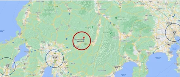 The sign is located in the Kiso Valley in Japan, on a hiking path between two towns, or rather villages: Magome and Tsumago. Kiso Valley is a geographical area in Nagano Prefecture in Japan, about 320 km away from Tokyo, 215 km from Kyoto, and 100 km from Nagoya, Japan's 4th largest city and Japan’s leading industrial center (Encyclopaedia Britannica, 2016). The following map shows Kiso Valley's distance from current important centers in Japan (figure 2).