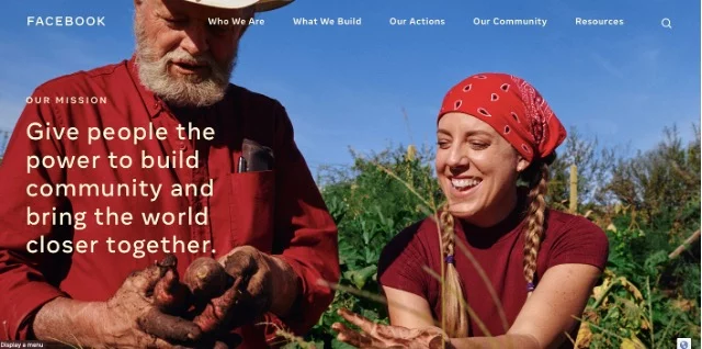 Facebook as a company, is an active player in articulating a specific media ideology (Gershon, 2010). This media ideology has a long tradition, it goes back to what Turner (2006) has called digital utopianism. Turner sees in Stewart Brand and his Whole Earth Network and shows the start of the fusion of counterculture values — including back to the land movements-, cybernetic theories and neoliberal libertarianism —into a techno-liberating narrative. Barlow’s famous Declaration of the Independence of Cyberspace is emblematic of the anti-government stance of this digital utopianism. Cyberspace was described as a global place where minds could come together, ‘a world where anyone, anywhere may express his or her beliefs, no matter how singular, without fear of being coerced into silence or conformity’ (Barlow, 1996). A world also where governments have no sovereignty. Central in that new world was the liberated individual that could connect with people around the world. In Facebook’s version of digital utopianism, technologies are also framed as liberating and empowering. Technology, it seems, is inherently progressive. In image 1, we see Facebook’s mission in words and in one carefully chosen image. The essence of Facebook, so it seems, is to ‘Give people the power to build community and bring the world closer together’. The image of the young women and older man adds meaning to what this ‘bringing closer’ can mean. We see an intergenerational relation that is clearly inherently happy. Both the older man, and the young women have smiles on their faces. Man and woman are closely connected to the soil — harvesting carrots under a clear blue and sunny sky —; a strong metaphor of being part of a local community. Technology is so frictionlessly integrated in daily life, that it is completely absent from the picture. It is Facebook’s mission slogan that lets us see this pictured relation as the effect of technology that brings people together as people, and as part of a local community. In Facebook’s discourse, there is no contradiction between local and global communities, between nature and technology and between young and old.