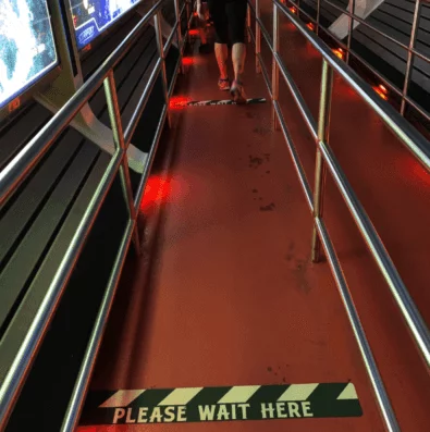 An explicit example of attempting to influence guest behavior would be the lines and signs as visible in the pictures above. They communicate desired behavior. Employees are supposed to be the ones checking on this. They, together with security are the ones who also enact "punishments" for guests who do not follow the rules.