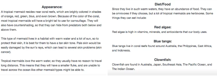 Interestingly, the communities on AminoApps do not say anything about the tail of the Mermaid in their Wiki’s, while other websites do share specific guidelines for how your tail can look. The website ‘Mermaidscorner’ shows the differences between the tails for each Merkin type. For example: the tropical mermaid should have a tail with coral colors to help with the camouflage (Mermaidscorner, n.d.).