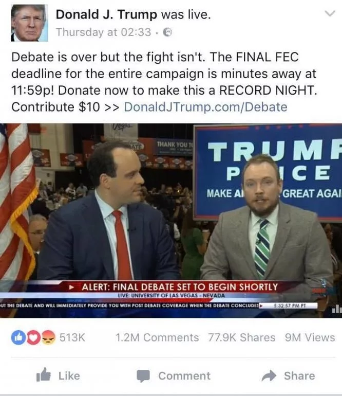In comparison to the massive live video right after the debate, the next live video on Trump’s Facebook account is from Ohio. On Facebook, there is an option to create an 'event' to let all of your followers know where and when you are going to be. This makes the event even bigger, because all the followers from Ohio would know for it. As might be expected, Trump again went out this night with a message JOIN ME LIVE IN OHIO! He made it personal, and his video's look amateuristic, and one might say even more 'real'. Of course it is obvious that the video is recorded by somebody else. The numbers under the post are not as high as the video mentioned above, but it should not be underestimated. 173 thousand reactions, including like, love and angry; 147 thousand comments; 25 thousand shares; and the most significant number is that of viewers–over one million.