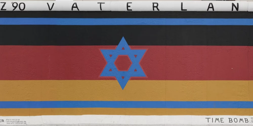 The use of the German flag, with elements of the Israeli flag overlaid, symbolizes the connection between the troubled past of Germany during the Nazi era and the creation of the state of Israel as a homeland for Jewish people after the Holocaust. It also represents the idea of reconciliation and unity between the two nations, despite their complex history.
