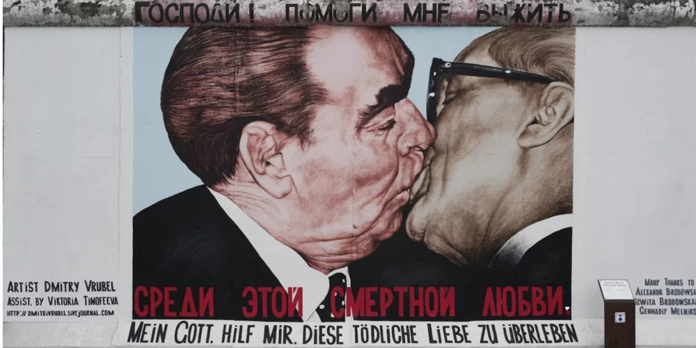 By showing the leaders in a romantic embrace, the mural satirizes the official propaganda and rhetoric that emphasized the brotherly relations between the two countries. It subverts the traditional depiction of powerful men as harsh and unemotional by portraying them in a vulnerable and intimate moment. It captures the absurdity of the political situation and a historical moment when the old political order was crumbling, and a new one was about to begin.