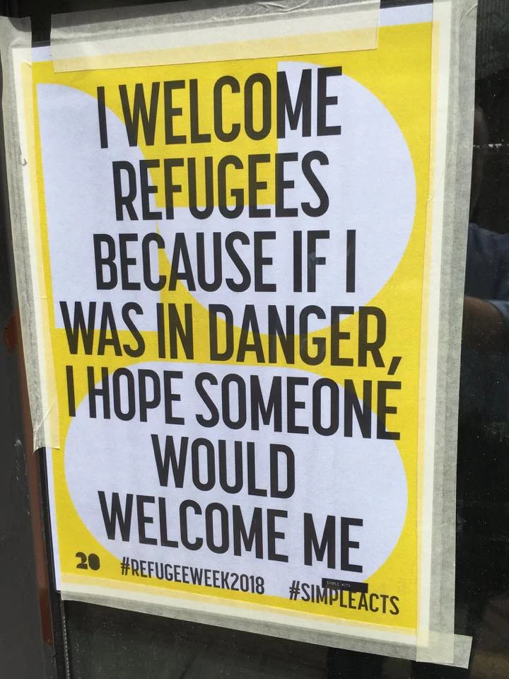 One fact was overlooked, however. In any physical geographic location, "offline" public signs often contain pointers towards online actions too. We can see this in the following poster, in which hashtags such as #refugeewekend2018 take us from an offline message displayed in physical space to an online area of activism, community formation and information exchange.