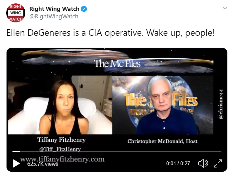 Another Twitter account connected to Tiffany FitzHenry is @RightWingWatch. It is an online magazine, and according to their Twitter bio “a project of People For the American Way that monitors and exposes the activities of Radical Right political organizations”. They once tweeted a video where FitzHenry was in conversation with a right-wing conspiracy theorist about Ellen DeGeneres being a CIA operative.