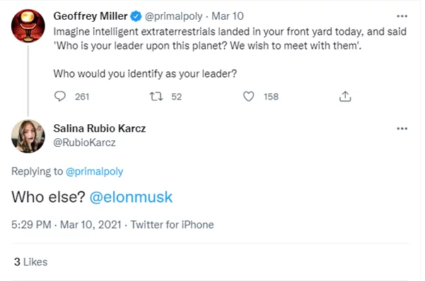 Of course, these two fans are exemplary but it does show the kind of effect Elon Musk has on his followers. Gomez’s reply in which she calls Musk her leader is a good example of the way fans refer to Musk. They often call him ‘the best’, ‘their leader’, or they say that he is someone they look up to, admire or respect (see Figure 3). When people then critique him in the comments, they will fire back and disagree. They have blinding faith in him and his endeavours. His fans also tweet at him to let him know they bought a Tesla car or that they are really enjoying their car. His fans are extremely vocal in letting their support for Musk known.