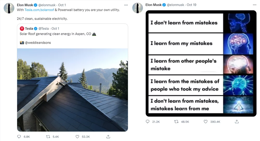 The interaction with his meme tweets is usually really high and the memes are the genre with the highest interaction on Twitter. As a quick comparison, two tweets from Musk with one being a meme and the other about a Tesla solar roof were posted in the month of October in 2021 at around the same time of the day (2pm). The Tesla tweet received 6.8k replies, 5.4k retweets, and 53.3k likes while the meme tweet received 21.2k replies, 45.7k retweets, and 390.4k likes (see Figure 1). The difference here is significant and this simple comparison shows the difference in interaction with memes tweets and content-related tweets from Musk.