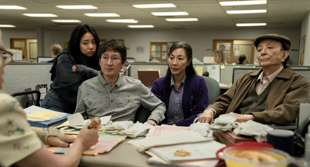 Everything Everywhere All at Once opens on a chaotic day in the life of the uninspired Chinese-American immigrant Evelyn Wang (Michelle Yeoh), who runs a failing laundromat with her sweet, cheerful husband Waymond (Ke Huy Quan). While Evelyn attempts to simultaneously organize a dazzling Chinese New Year party and prepare for an all-decisive meeting with her grumpy IRS tax auditor, Deirdre (Jamie Lee Curtis), tensions are running high. Evelyn’s demanding father (James Hong) has just arrived from China and takes every opportunity to comment on her ‘stupid’ decision to marry Waymond and move to the land of the so-called ‘free’. Her daughter, Joy (Stephanie Hsu), wants to introduce her girlfriend Becky (Tallie Medel) to her grandfather but is shoved back into the closet by her dismissive mother, who fears grandpa is ‘too traditional’ to understand. Oh, and Evelyn’s husband has been trying to serve her divorce papers all day. Evelyn is so caught up in life’s meaninglessness that she doesn’t even notice. The Wang family is on the verge of completely falling apart, crushed by the reality of the American Dream. But what if things were different?