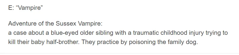 An example of TJLC meta can be found in the following text post. The word “Vampire” was used in a texting conversation in episode one of season four, which caused this TJLC’er to take a closer look at one of the original Sherlock Holmes stories by Arthur Conan Doyle called “Adventure of the Sussex Vampire”, (1927) and draw parallels between this work and the events in season four of Sherlock.