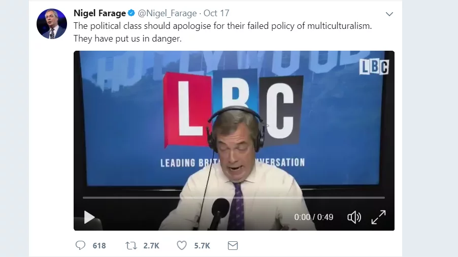 Oppenheim, M. (2017, March 23). Nigel Farage blames Multiculturalism for London Terror Attack. Independent. Retrieved last on October 14, 2017.