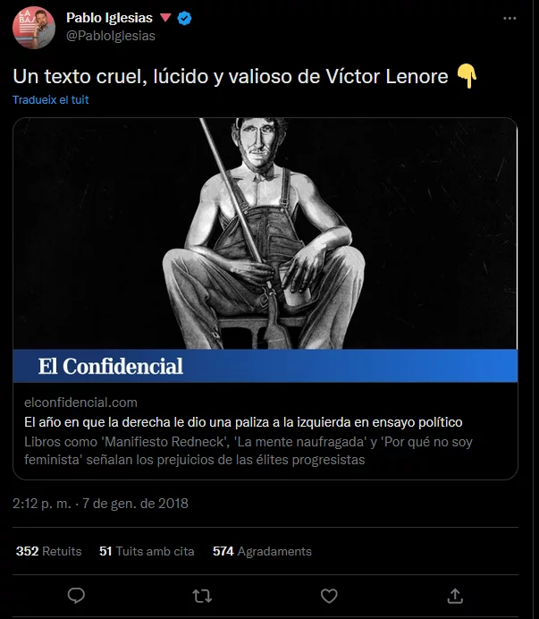 We can find a great example of that in the Redneck Manifesto (Jim Goad, 1998). McInnes called Goad “the greatest writer of our generation” and listed this book as one of the three 'required' books on modern Western culture. This book also has a certain degree of acceptance among some sectors of the left. When this book was translated into Spanish in 2018, Pablo Iglesias, leader of the Spanish left party Podemos, praised an article titled “The year the right beat the left in a political essay”.