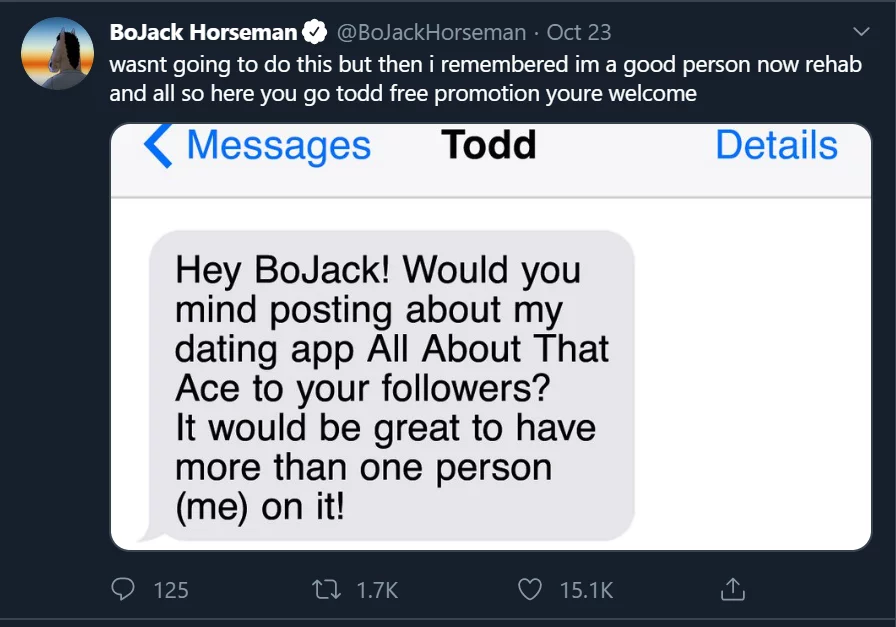 The storyline isn’t just contained within the framework of the television show. Instead it lives on through a Twitter account run by BoJack himself. It’s almost as if viewers can have real life interactions with their favourite alcoholic horse. “Real life” BoJack makes references to previous episodes, entices fans with silly tweets and shares fan edits.