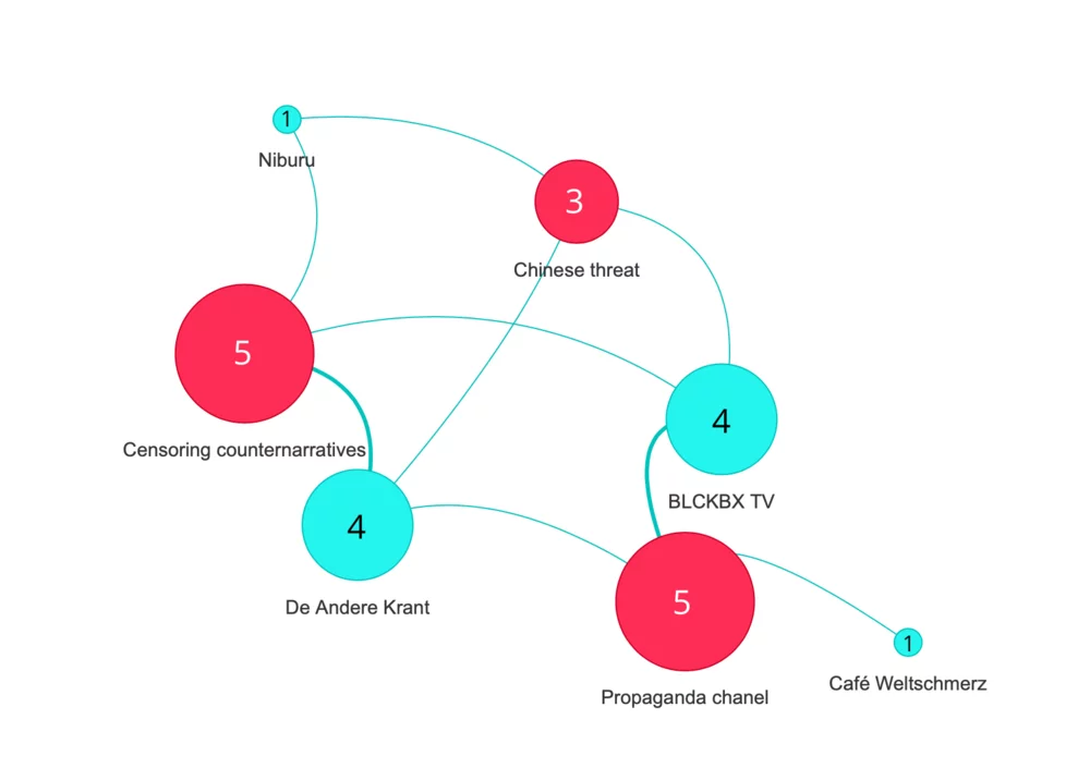As can be seen in Figure 3, not all narratives are discussed at the same volume by the different conspiracy media. De Andere Krant is mostly focussed on how TikTok is censoring narratives that counter the mainstream, while BLCKBX TV focusses more on how elite organizations use TikTok as a propaganda channel. Sometimes multiple narratives are weaved together in one article/video. All media, however, connect TikTok to existing narratives of censorship and propaganda to a certain degree.