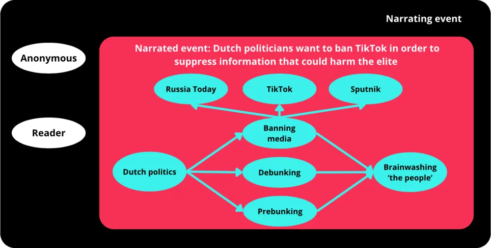 The narrating event again plays out between an anonymous author and the reader. The narrating event, however, is rather complex, as can be seen in Figure 7. It describes how the Dutch government is brainwashing citizens by debunking and prebunking claims the author holds to be true, and by banning media coming from countries that oppose Western hegemony. Banned media that are explicitly mentioned are the Russian broadcasters Russia Today (RT) and Sputnik, as well as the ‘Chinese’ app TikTok. The Russian media were banned due to the pro-Russian propaganda they trafficked in the context of the war in Ukraine (NOS, 2022). TikTok was banned from the devices of state officials out of fear for Chinese espionage (NOS, 2023).
