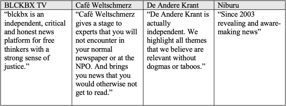 At the same time, these conspiracy media present themselves as ‘professional journalists’. On their about-pages, we find vivid descriptions of their journalistic valor. I have collected some snippets in Table 5 (Note: Niburu has no about-page, but their slogan has been included). All of them distance themselves from mainstream media. Café Weltschmerz is very explicit in doing so. The other three are more implicit. For example, when BLCKBX TV refers to themselves as an ‘honest’ platform, they imply that other media are dishonest. Being independent, critical and honest is the bare minimum for a news platform, you would say. But by explicating their own independence, critical stance and honesty, they also implicitly discredit other media. Apparently, these are not independent, not critical and not honest. This implication of ‘we are the real journalists’ is found throughout the conspiracy media landscape (Den Boer, 2022).