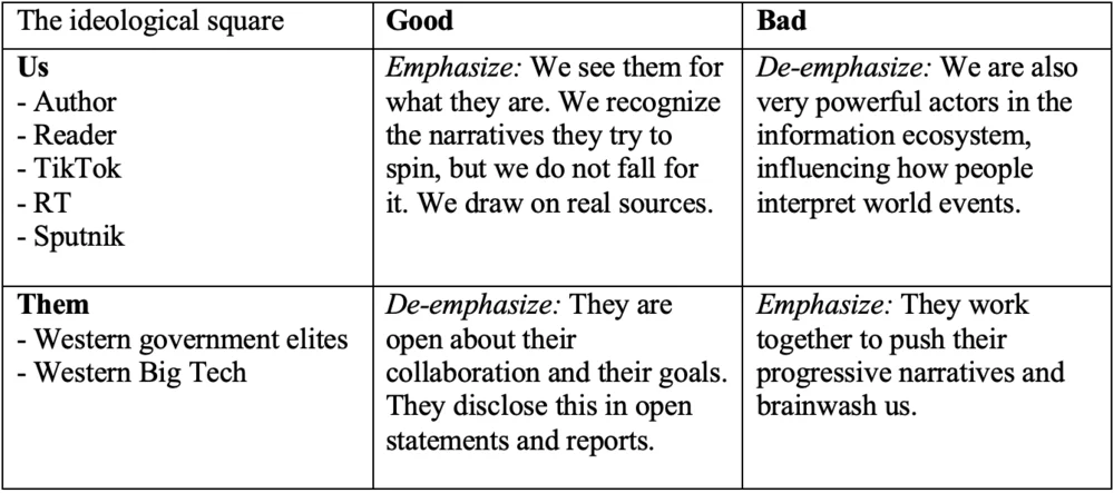 As censorship and propaganda are two sides of the same coin in the struggle imagined by conspiracy theorists, the ideological square (Van Dijk, 2011) we can draw up based on this second narrative is very similar to the first one. This article is representative of 5 other articles about TikTok as a propaganda channel.