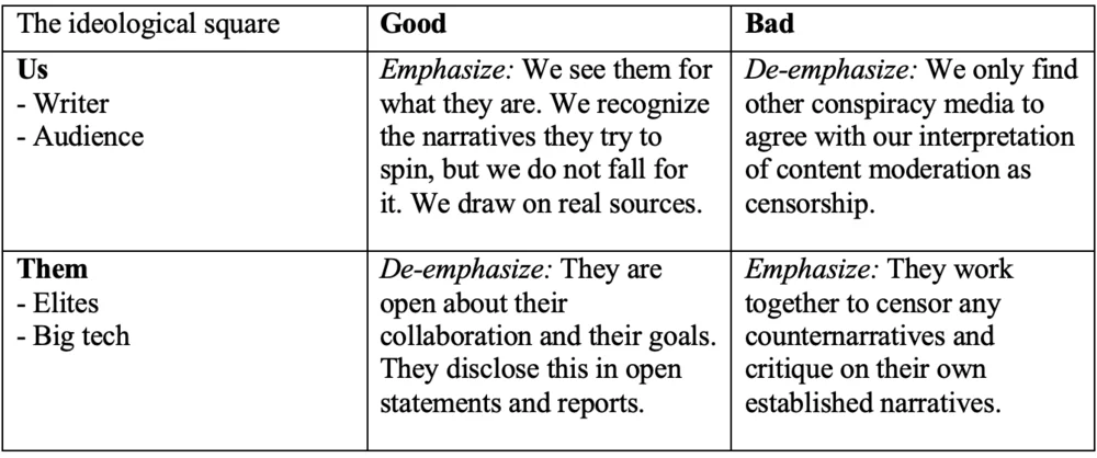 This article is emblematic of the narrative that TikTok is censoring counternarratives (in collaboration with elite governmental organizations), which is portrayed in a total of 5 articles in the data. We can summarize this narrative as a poplist conflict in group relations between ‘the people’ (Us) and ‘the elite’ (Them) that is at the root of conspiracy culture by plotting it in an ideological square (Van Dijk, 2011).