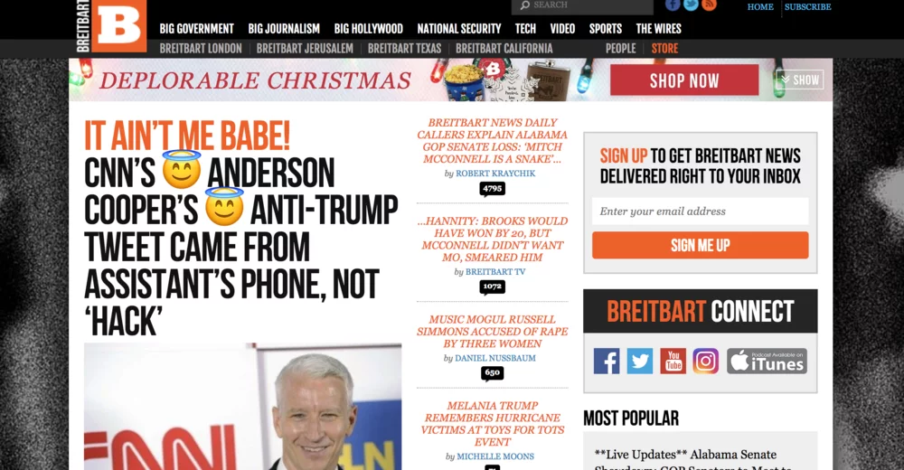 Finally, in 2012, Bannon became a founding member of Breitbart News, a brand-new news organization devoted to commentary and publications opposing the liberal views of establishment media. During the 2016 election, Breitbart gained mainstream media’s attention after the promotion of numerous alt-Right conspiracy stories centered around then presidential candidate Hillary Clinton. Among these included the infamous Pizzagate story, where Clinton and her staff were accused to running a child pedophilia ring through a pizza shop in Washington DC. This conspiracy ended when an armed man broke into the shop one day “searching for children to save.” Thus, under Bannon’s leadership, Breitbart began to take a more alt-Right approach and formally became a key website in the spreading news and ideas of Trump’s new supporters.