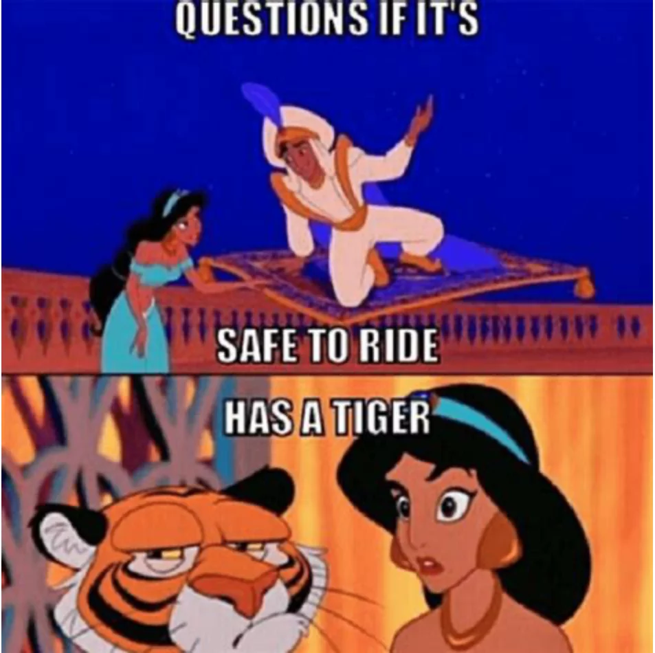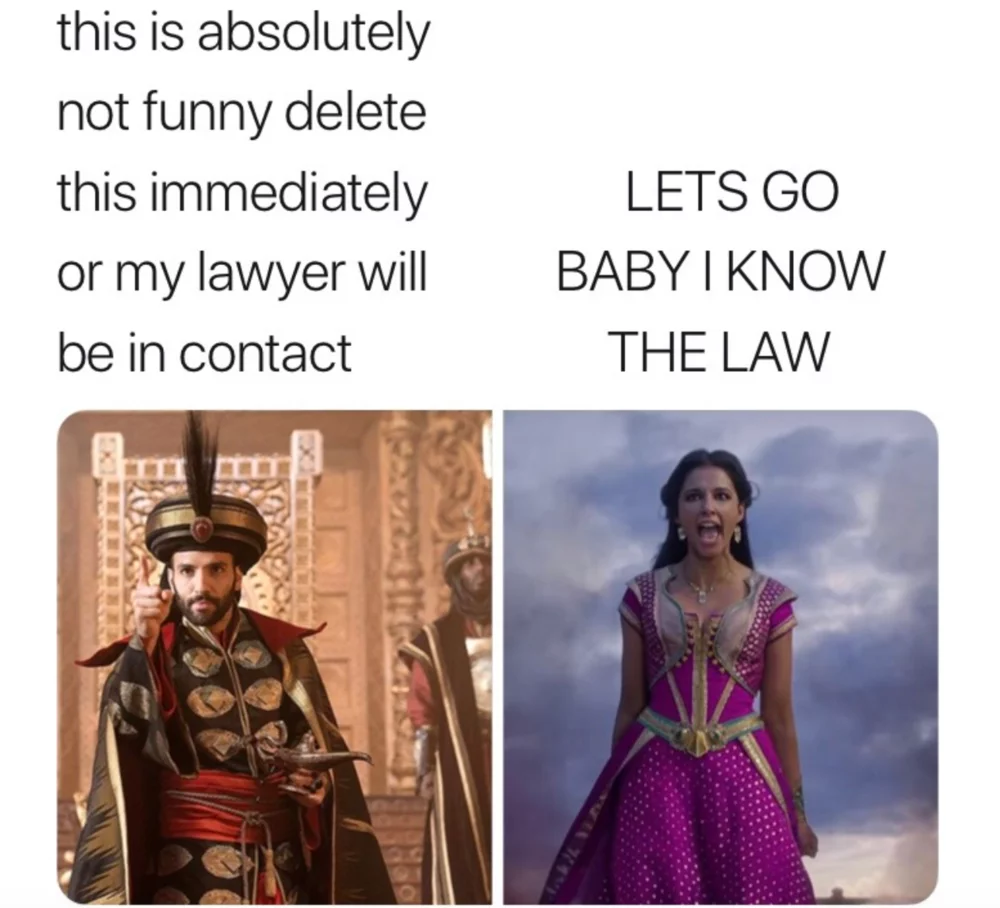 Aladdin movies had a broad online media response. Internet users have picked up Aladdin's new storylines in discussing and comparing the films reactions signified responses to the changes . The striking difference between the 1992-2019 Aladdin memes is the most evident in relation to Jasmine. In content related to the animated film, the princess is mostly portrayed as silly and naive (Figure 8). Jasmine is portrayed as a figure trusting the man and following him. One of the memes captured the scene from the movie criticizing the heroine: "Wears golden bracelets, says she has nothing to pay with". The phrase is applied to the cartoon version of the film meaning the silly nature of the female character. However, this pattern is different in the memes relating to the 2019 movie. There, Jasmine’s appeal is knowledgeable (Figure 9) and independent, as in making her own rules and not following anybody.