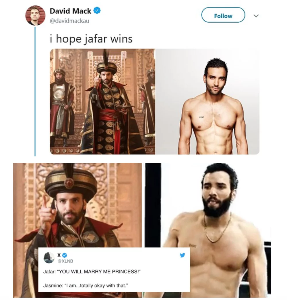 Another amount of memes related to the male cast’s appearance. Many of the memes of 2019 refer to the physical appearance of the actors playing Aladdin and Jafar in the movie (Figure 10), objectifying them, which is quite unusual for the presumably children’s film. Numerous tweets overlap the actor with the fictional character, interfering with the plot. "I hope Jafar wins" is one of the popular users' reactions. This, of course, is not the case with the content related to the 1992 version. The memes about the older version of Aladdin refer to his adventurous character and willingness to show the world to Jasmine (Figure 11). Jafar appears evil and desexualized in the memes referring to the earlier version.