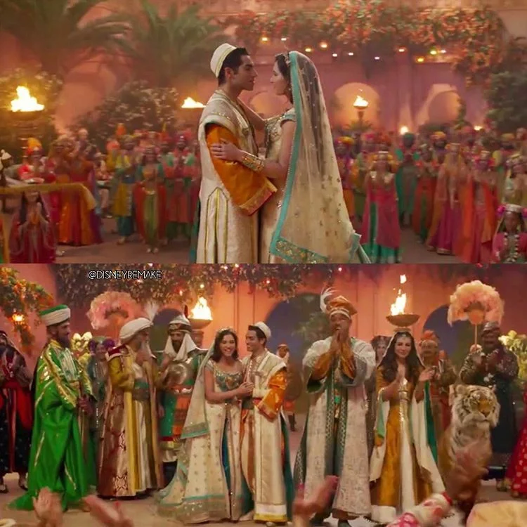 What has also remained throughout both works, is the development of the plot constructed around the need for Jasmine to marry (Figure 5). The whole narrative of the story revolves around Aladdin making attempts to win her over, else she has to marry somebody else. The plot twist and conflict narratives reach their peak when Jafar wants to walk down the aisle with Jasmine.