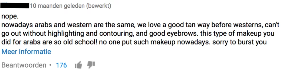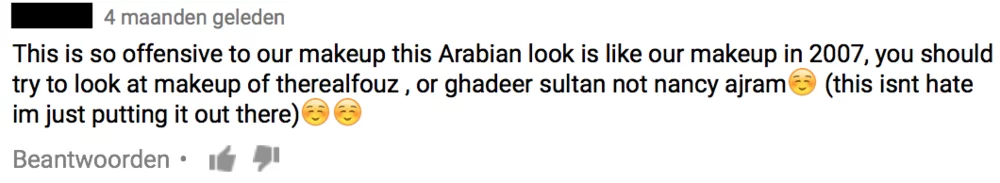 Western culture is the most dominant in this micro-population; people from America, Canada, Australia and Europe fall under the same centre of normativity in which the same techniques and trends apply. The ‘how to’ video, I discussed previously is a good example of the norms in this centre. Interestingly, you would expect that Muslim/Arabic culture is a centre on its own. However, it seems to be the case that makeup lovers from Arab countries and Western countries have the same norms. There are various videos on YouTube that seem to point out the difference between these two cultures. However, many Arabs commented (figure 3) that that is ‘old school’ and that their makeup is actually similar to Western makeup.