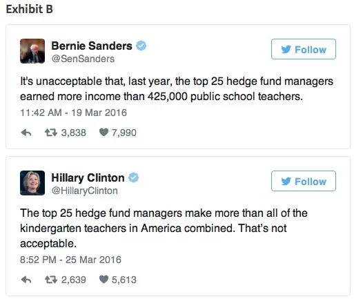 Clinton, H. (2015). "The top 25 hedge fund managers make more than all of the kindergarten teachers in America combined. That’s not acceptable." Tweet.