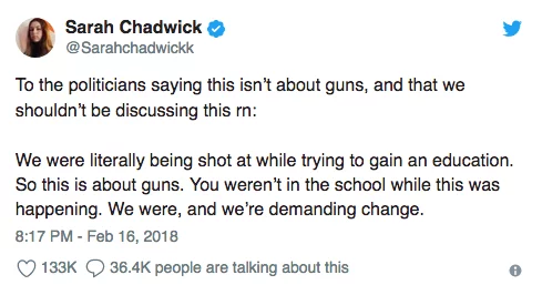 This could be seen as a direct response to Trump’s reply after the shooting at Marjory Stoneman Douglas as he did not mention gun violence. Instead the president tweeted that he was sad that “the FBI missed all of the many signals sent out by the Florida school shooter.” He went on to say that it was unacceptable and too much time is spent trying to prove Russian collusion with the Trump campaign, ending with the statement that the FBI should get back to the basics and makes us all [Americans] proud.