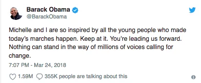 Corin’s tweet ended with a sarcastic ‘thoughts and prayers’, alluding to the fact that after every mass shooting, condolences are sent and everyone prays but they mourn and move on until it happens a second time. These students are saying there should not be a second time, and they seem to have some powerful people in their corner as Barack Obama, 44th president of the United States, also tweeted out a supportive message.