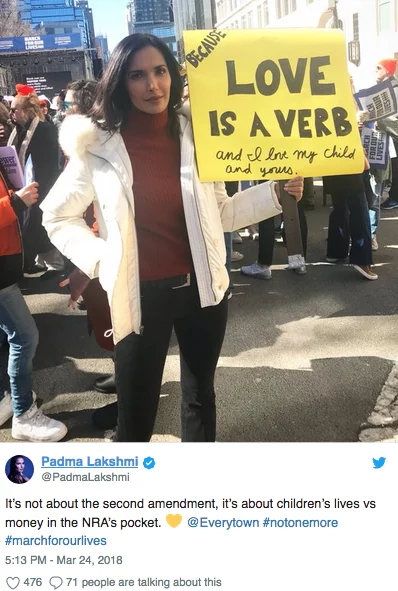 The tweet reads that LaPierre Jr never spoke about life in his speech regarding the Declaration of Independence, stating that she took it as a message that guns are more important than the lives of students. At the #MarchForOurLives walkout, many celebrities showed up to support, capturing even more online attention. Padma Lakshmi attended as well, as can be seen in Figure 5, where she tweeted that the marches and protests for gun reform and sensible gun laws were no longer about the second amendment but about how much money the NRA was receiving with each purchase.