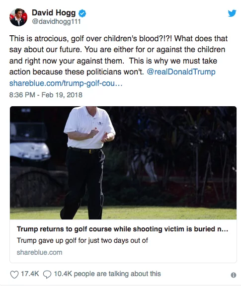 Other instances of survivors calling out authorities include Dalvin Hogg tagging Trump in a tweet (Figure after a website reported him playing golf while a victim who had passed was being buried nearby. Hogg stated that “This is why we must take action because these politicians won’t.” as can be seen in Figure 7 below.