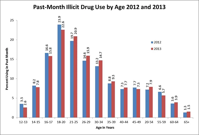 This video is a fitting example on how unconventional norms are publicly being tested in an era of digitalization, as these people all act outside of the bounds of the ‘conventional’ norms. In modern western culture, one could say it is not ‘usual’ or normal for elderly people to smoke weed. According to the National Institute of Drug Abuse, the weed culture is largely dominated by youngsters. As seen in the figure below, Drug use is highest among people in their late teens and twenties. In 2013, 22.6 percent of 18- to 20-year-olds reported using an illicit drug in the past month. From the category with people of 65 years and older, only 1.5 smoked cannabis in 2013. There is also the common stigma on cannabis use, (sometimes) associating the usage with criminality, drug abuse and addiction.