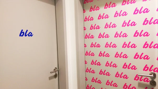 In Figure 2 two doors for toilets can be seen. These doors can be found in an unknown restaurant in Germany. One of the doors contains a blue word; “bla”. The other one contains multiple pink “bla’s”, the whole door is covered with it. It can be argued that the door on the right is for women since pink is seen as a feminine color, while blue is seen as a more masculine color. Another argument is how talking a lot is a stereotype generally used to describe women, whereas it is more of a gender norm for men to talk less than women. In terms of language, onomatopoeia is used, a universal word, namely “bla”. It is a term that everybody recognizes and can understand.