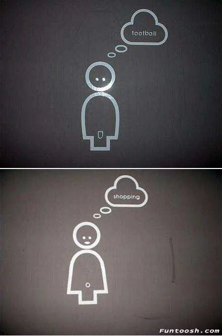 Moving away from signs focusing on genitalia, we see another example of signs that rely on the audience to read English. These signs can be found in one of the PentaHotels in the United Kingdom. Although the words used in Figure 5 are slightly more common and simple than the references in Figure 4. It does, however, on top of the language aspect, play into gender norms as well. The illustrations are very similar, with the largest difference coming in the form of the word in the thought bubble. The top one shows a person thinking about football, a hobby seen as masculine, thus this indicates the men’s bathroom. The women’s bathroom is indicated with a person thinking about shopping, a hobby considered to be feminine. Possibly simpler than the previous figure, but also more stereotypical.