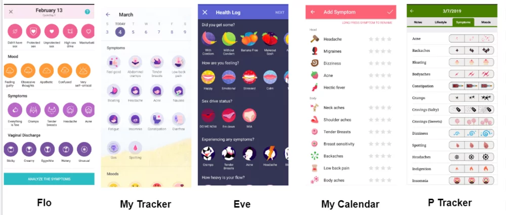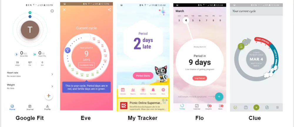 A search for “period tracking app” in the Google Play store returns approximately 250 results. I selected the five most popular/relevant as per Google Play’s search algorithm - My Calendar, My Tracker, P Tracker, Clue and Flo. In my initial survey of period tracking apps, there appears to be two categories: “generic” and “branded” apps. Additionally I included the Eve app in my analysis, as its parent company Glow has attracted some media attention lately and is frequently mentioned in articles about period tracking apps. Because of this, Eve also seemed essential to include in my analysis of “branded” versus “generic” apps.