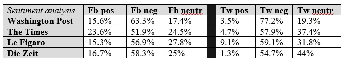 Finally, there is a difference when looking at the number of posts expressing their agreement with Hersh's claim. Except for The Times, the percentages on Twitter are higher than on Facebook. The biggest differences can be seen when looking at Le Figaro and Die Zeit. Where Le Figaro reported factually, Die Zeit did not.