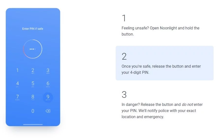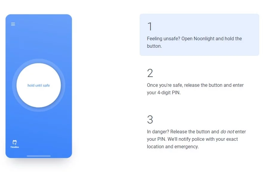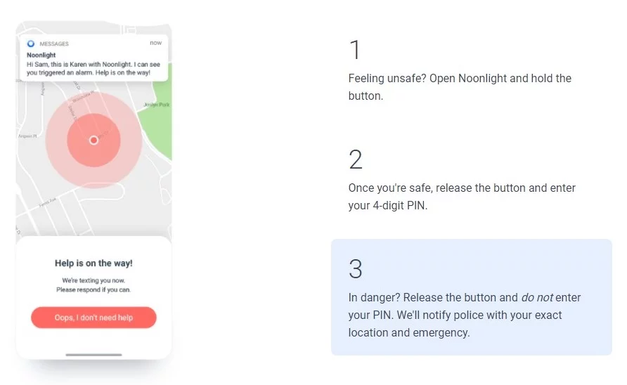 In other words, personal safety apps can change the interaction orders that are at work in surveillant landscapes. Interaction orders are, according to Jones (2017), “the kinds of ‘social situations that built environments help to make possible, including the possibilities for ‘mutual monitoring’ they make available, and the way they facilitate certain kinds of ‘performances’.” These interaction orders help to establish certain relationships between the watcher and the watched (Jones, 2017). For instance, police officers are often positioned as more powerful, or as promotors of safety in many public spaces. Sometimes this relationship is further reinforced by personal safety apps. Perhaps this is a logical choice, as McCarthy et al. (2016) found that a police monitoring feature in personal safety apps can have a positive impact on users’ sense of safety (McCarthy et al., 2016). The app Noonlight, for instance, notifies the police and sends them the user’s location if they don’t respond in time (as shown in Figures 2, 3, and 4) (Noonlight, n.d.).